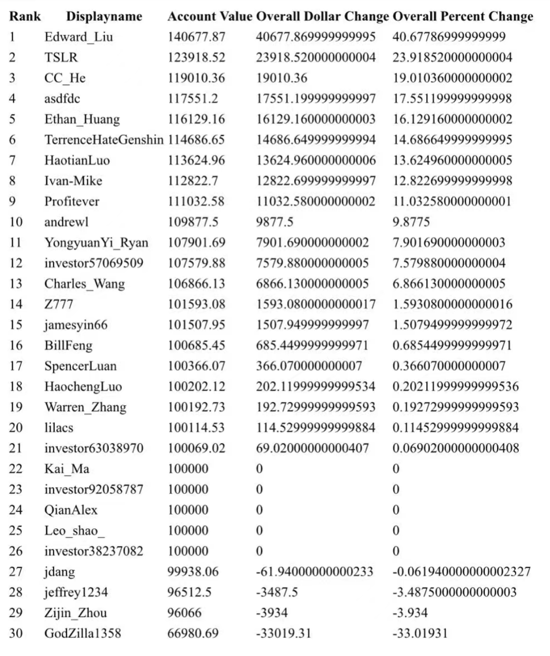 We are pleased to congratulate our Top 30 Best Investment Performers! This distinction reflects both their analytical skills and commitment throughout the program. The list of winners and their corresponding Display Names are shown in the image below.